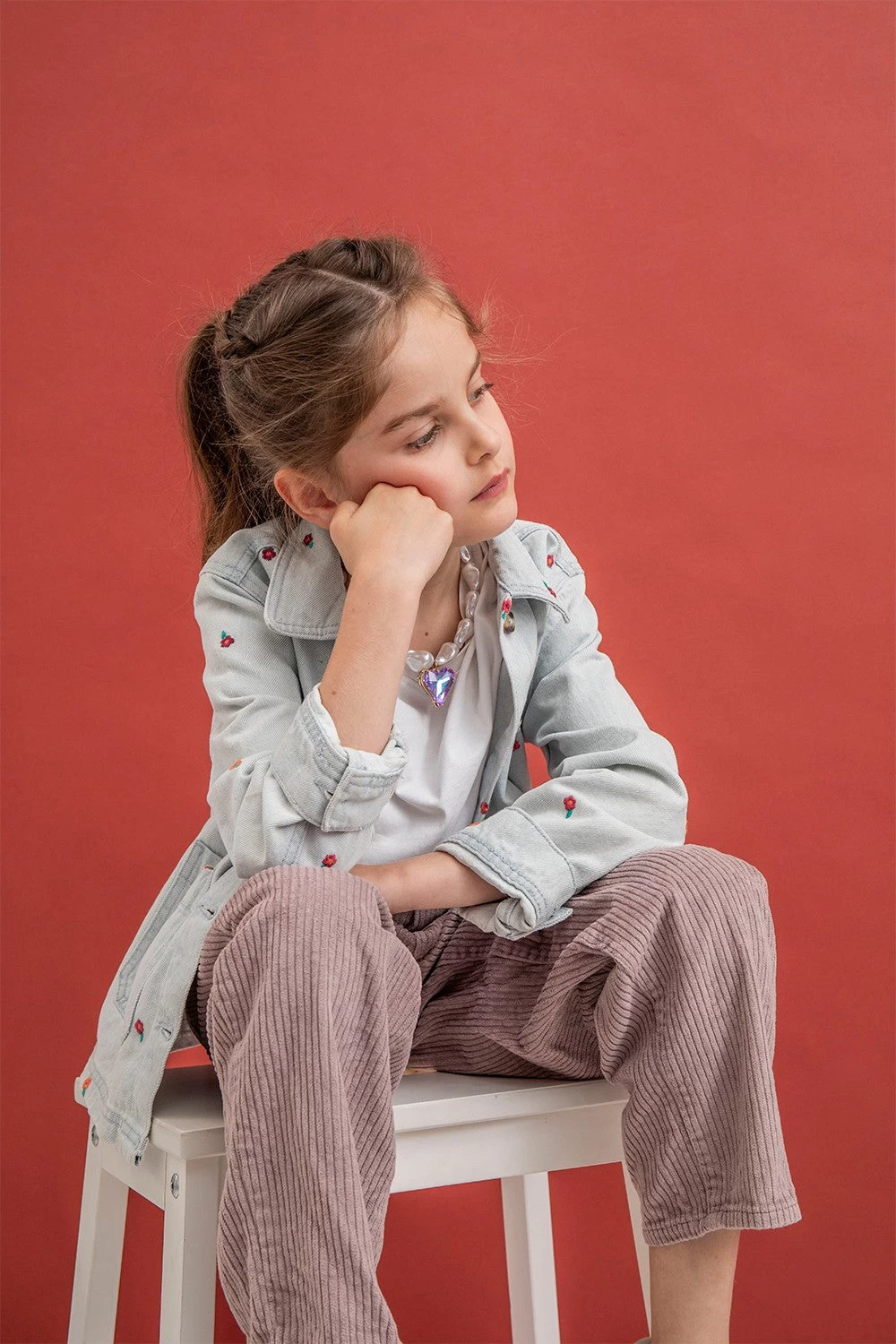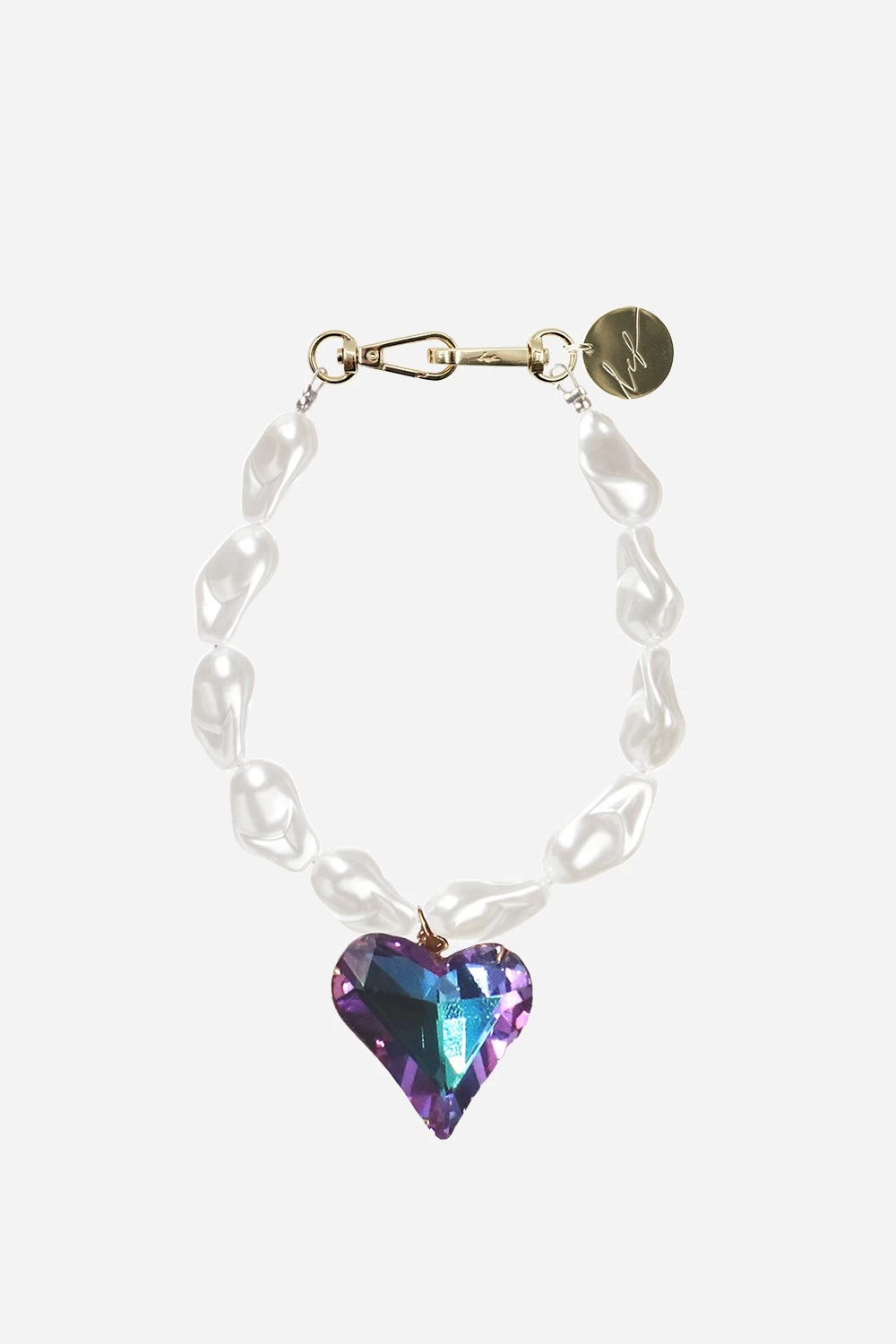 Chaîne bijoux Ariel 40 cm perles nacrées et cœur violet avec mousquetons dorés